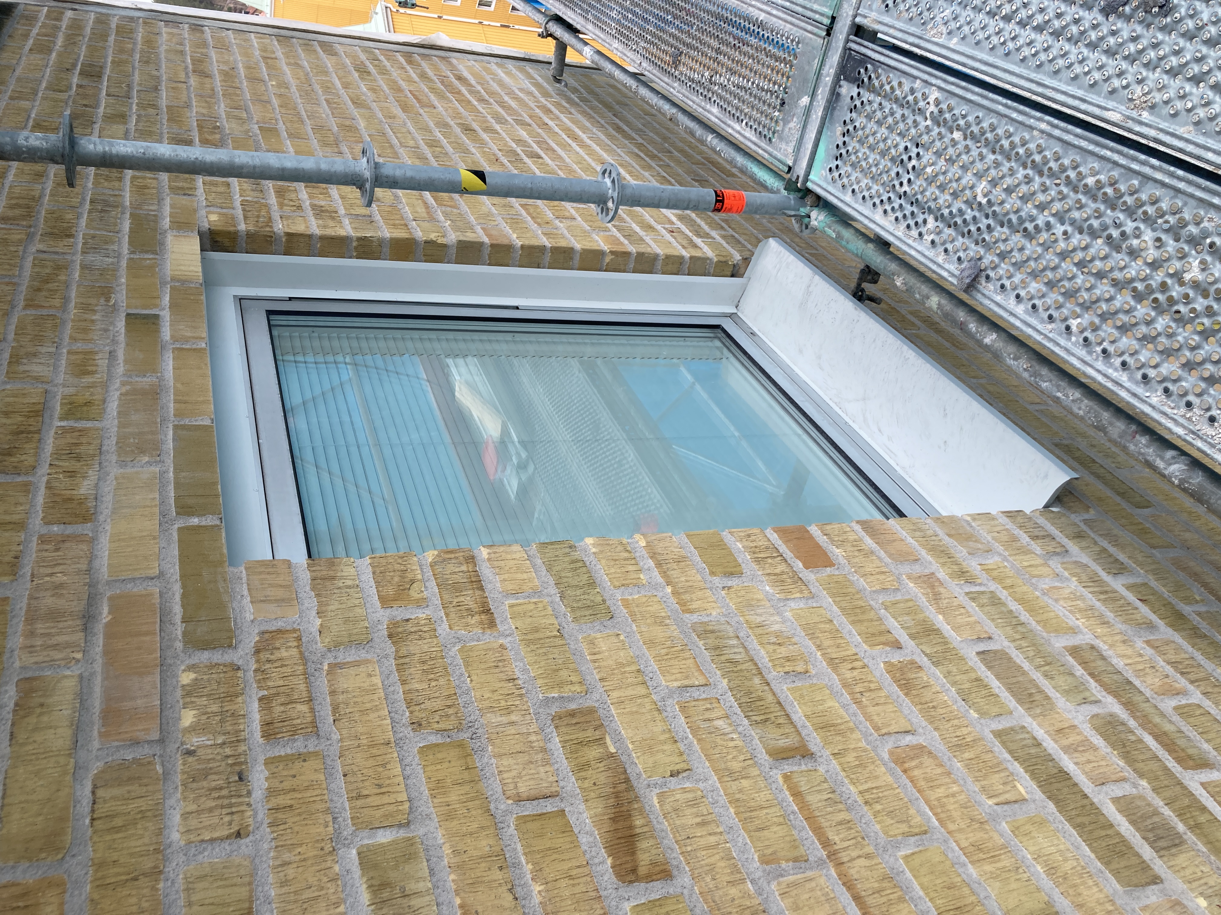 Byta av skadade balkar ovanför fönstren samt byte tegelstenar pågår.